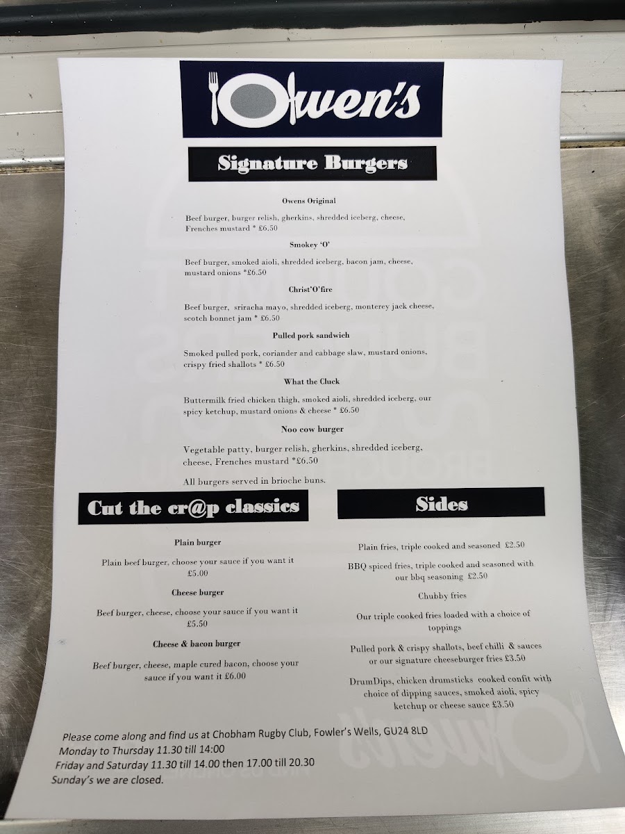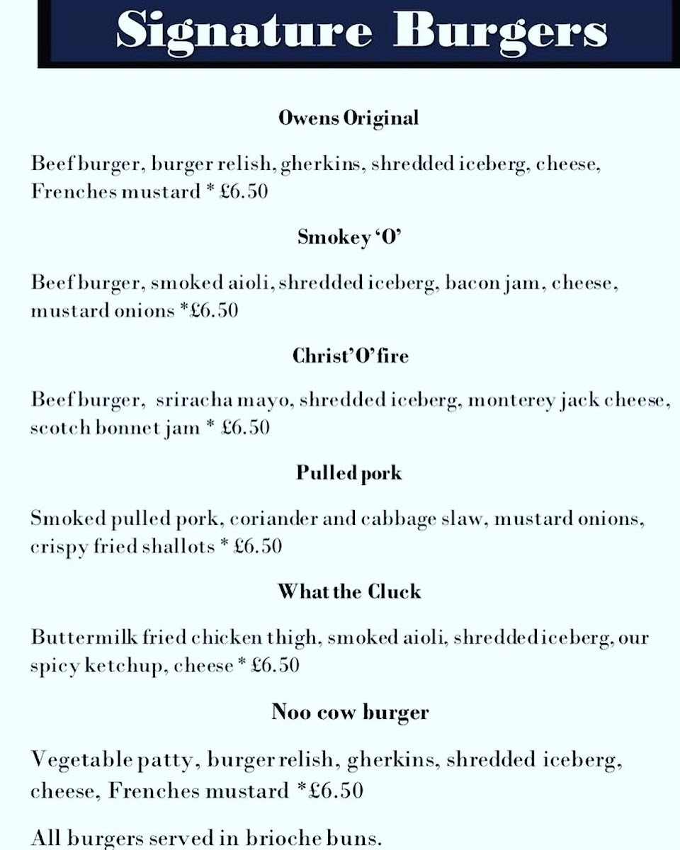 Welcome to Owen’s at Fairoaks, where delightful flavors meet a unique aviation backdrop at Fairoaks Airport. This charming café offers a tempting array of culinary delights that cater to every palate. Start your meal with indulgent BBQ Spiced Fries or Deep Fried Pickles, both perfect for sharing. The highlight of the menu is undoubtedly the Signature Burgers, featuring the succulent Pulled Pork Sandwich and the fiery What The Cluck. For those who prefer classic options, the Cut The Cr@P Classics section includes the satisfying Cheese & Bacon Burger.